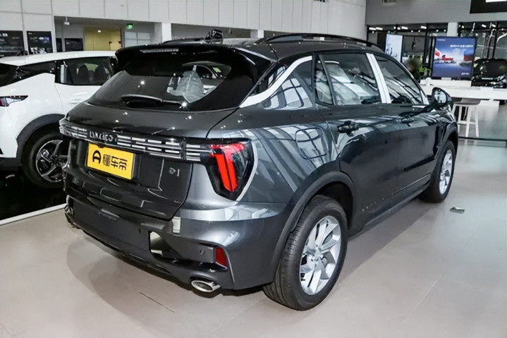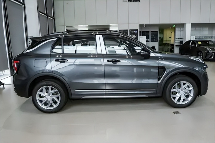 车身侧面依旧是领克01的强项。整体比例紧凑而流畅,腰线从前灯延伸至尾灯,贯穿式的光影线条让车侧视觉更修长。前者偏运动风格,后者则更强调力量感。车窗边框和后视镜外壳均采用亮黑喷涂,与车顶行李架形成视觉呼应。隐藏式C柱和悬浮车顶设计依然延续,使整车更具现代感。