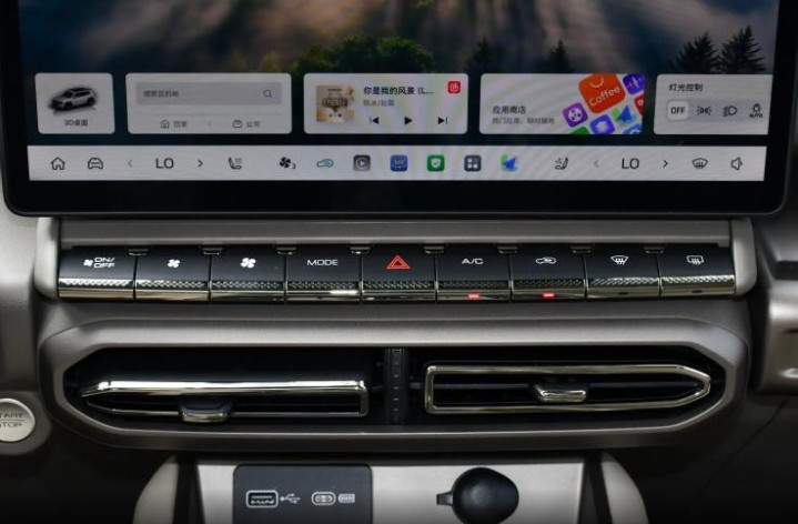 副仪表台上方大量采用平直的线条元素修饰前排座舱,左右两侧空调出风口造型为纵置对称布局,靠近中央一侧的空调出风口为横置设计,错落有序的布局风格增强了内饰的层次感。14.6英寸中控屏UI交互界面的清爽感可以给个高分,一般常用的功能放在底边栏,使用起来相对快捷,同时该系统还应用了卡片式操作,外加应用商店的支持,赋予座舱不错的科技感。另外值得一提的是,新车新换电子怀挡,为副仪表台区域留出了更为简洁的布局空间,上面集成了模式切换、音量调节旋钮等功能设定,符合操作习惯。